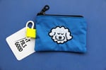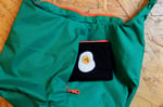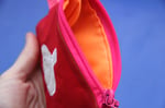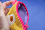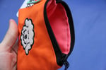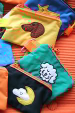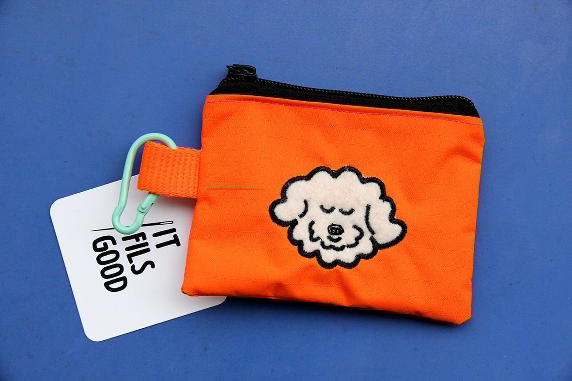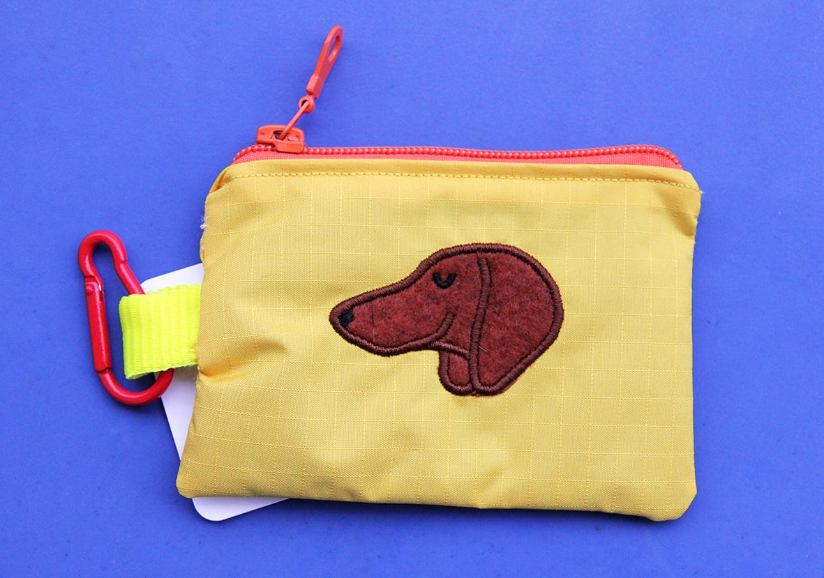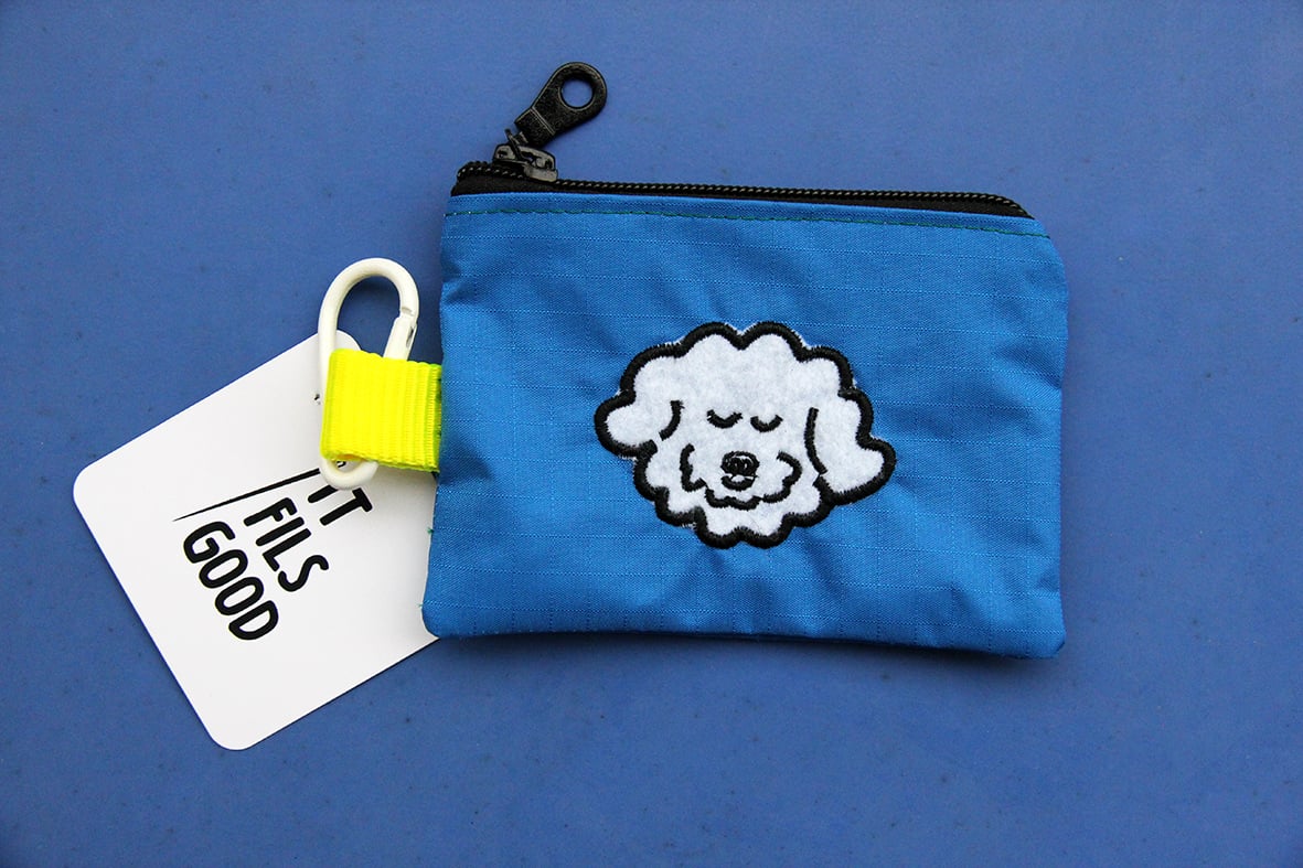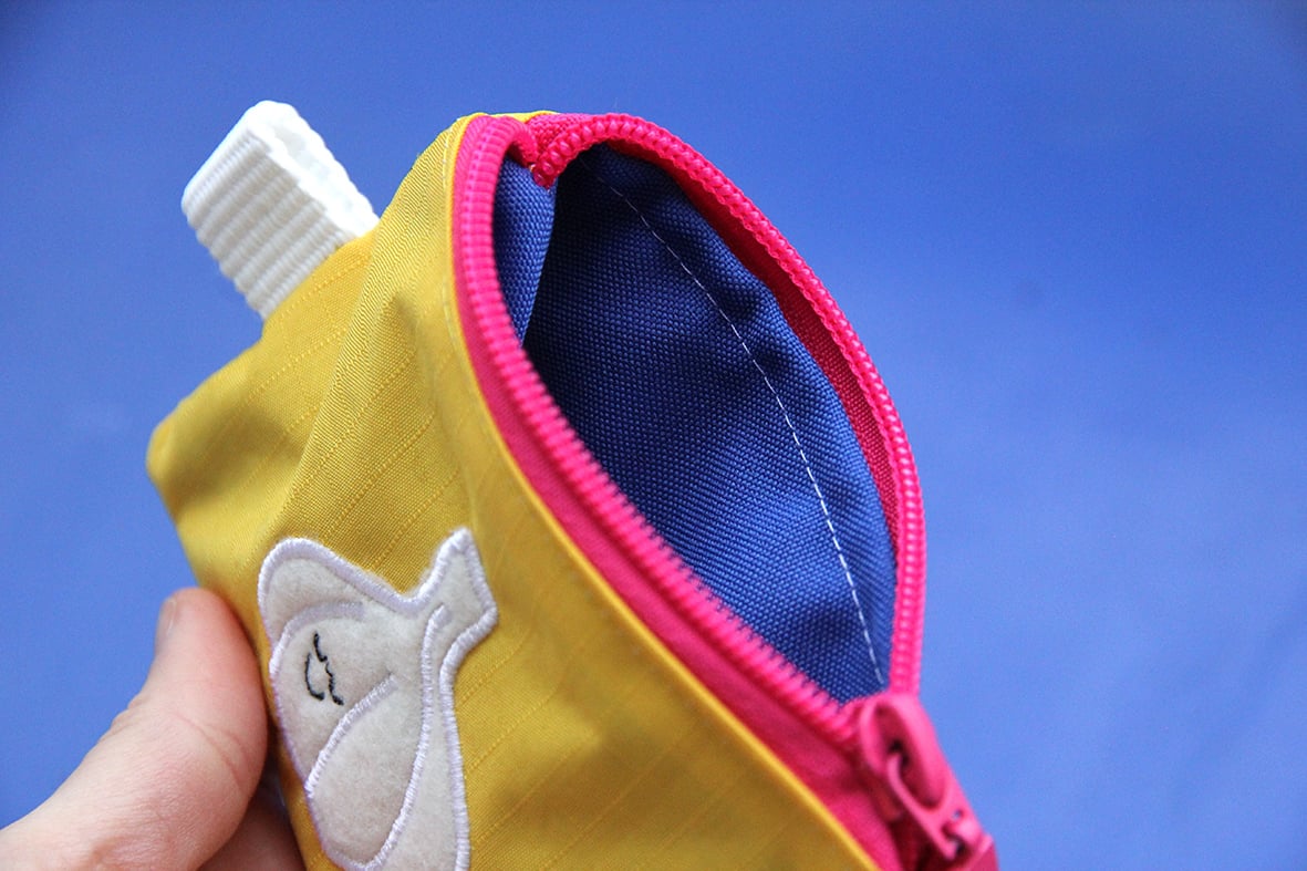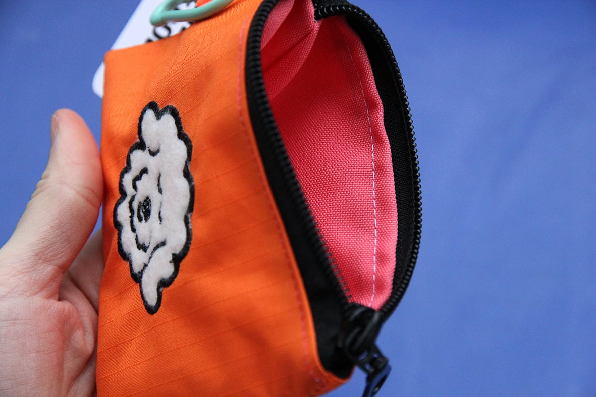 Broderie en appliqué sur tissu technique très résistant, imperméable et anti-déchirures. L'intérieur varie en couleur et le tout est tenu par un mousqueton et une sangle flashy !